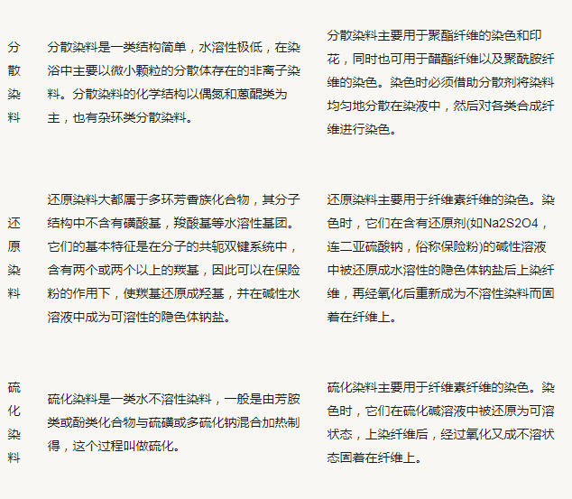 分為:直接染料、酸性染料、陽(yáng)離子染料、活性染料、不溶性偶氮染料、分散染料、還原染料、硫化染料、縮聚染料、熒光增白劑,此外,還有用于紡織品的氧化染料(如苯胺黑)、溶劑染料、丙綸染料以及用于食品的食用色素等。